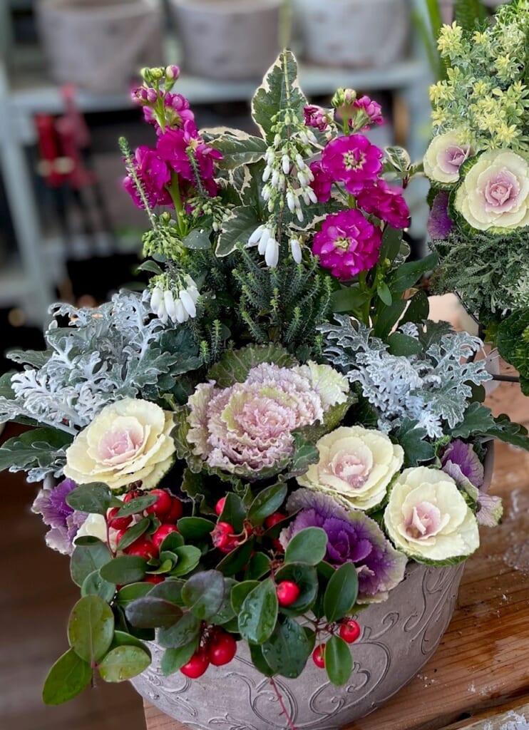 一年の始まりに美しい寄せ植えで彩りを添えませんか。7種類の季節の花々を華やかに植え、お正月らしい装飾を添え、生命力あふれる一鉢に仕上げます。